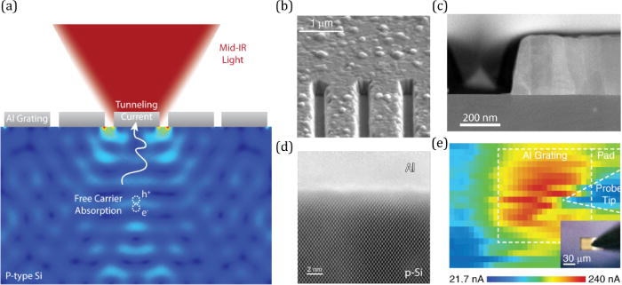 Infrared (IR) photodetection is of major scientific and technical interest since virtually all molecules exhibit characteristic vibrational modes in the mid-infrared region of the spectrum, giving rise to molecular spectroscopy and chemical imaging in this wavelength range. High-resolution IR spectroscopies, such as Fourier Transform IR spectroscopy, typically require large, bulky optical measurement systems and expensive photodetector components. Here, we present a high-responsivity photodetector for the mid-IR spectral region which operates at room temperature. Fabricated from silicon and aluminum, the photodetection mechanism is based on free carrier absorption, giving rise to a photoresponse rivalling commercially available cooled IR photodetectors. We demonstrate that infrared spectra of molecules deposited on this detector can be obtained by a direct electrical read-out. This work could pave the way for simple, fully integrated chemical sensors and other applications, such as chemical imaging, which would benefit from the combination of mid-IR detection, room-temperature operation, and ultracompact portability.